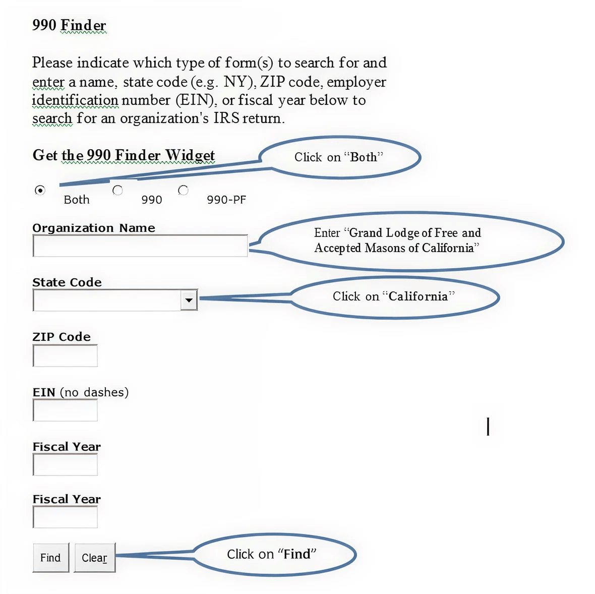 The following will assist you in completing the several 990 Finder data entry fields.