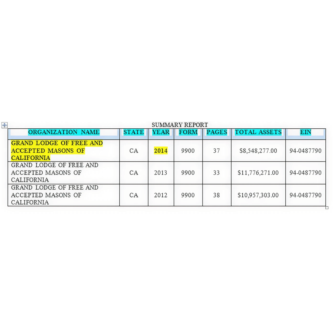 1. The result will display a summary report for the “Grand Lodge of Free and Accepted Masons of California” for several years (similar to the following);
